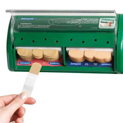 Wundversorgung mit einem Griff! Der Pflasterspender erlaubt das Entnehmen und Anbringen mit nur einer Hand.